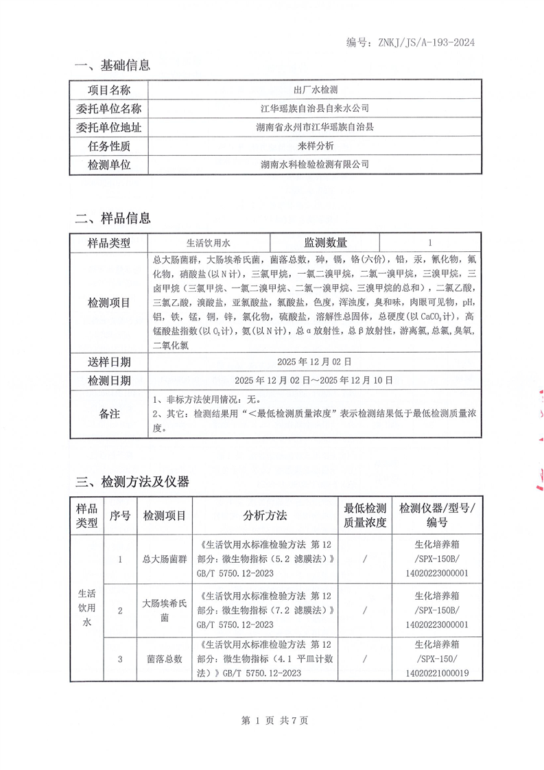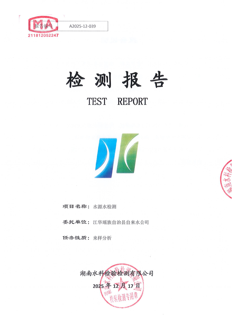 江华瑶族自治县自来水公司2025年12月份水质检测报告(43项)