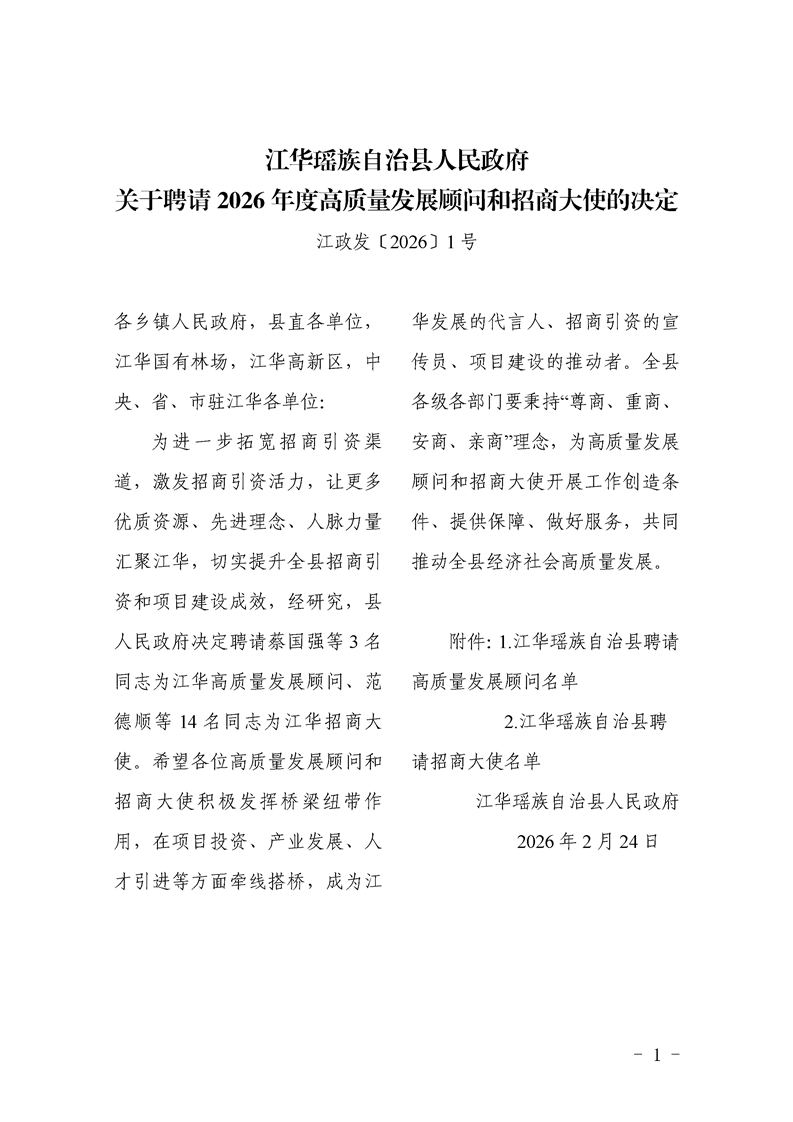 江华瑶族自治县人民政府关于聘请2026年度高质量发展顾问和招商大使的决定