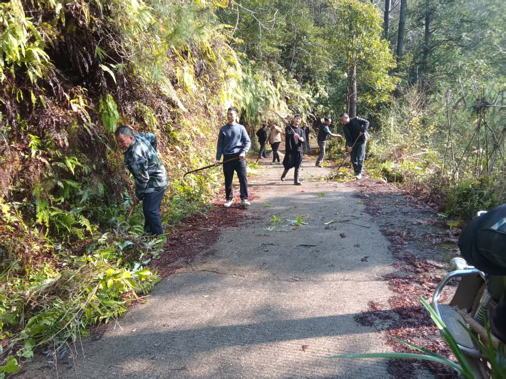 2月14日,江华瑶族自治县湘江乡中央新村龙井组村民开展道路砍青除障行动。