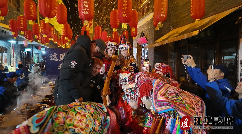 傍晚时分,冠军队来到水街铜梳广场,参与瑶家特色长桌宴与民俗互动。长鼓迎宾、高山流水、竹竿舞、花船表演等轮番上演,瑶家儿女载歌载舞,与冠军队员们同吃同乐、共话情谊。队员们沉浸式体验瑶族爬楼、竹竿舞等民俗活动,品尝瑶家十八酿、腊肉、油茶等特色美食,在浓郁的瑶乡风情中,感受江华人民的淳朴热情与民族文化的独特魅力。