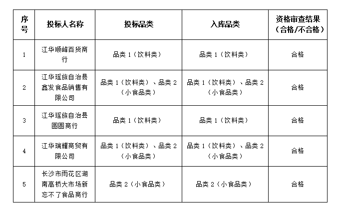 我公司组织相关人员组成评审小组,依据遴选公告的相关规定,对全部12家报名单位提交的申请资料进行了资格审核。评审遵循公开、公平、公正的原则,经综合评议,有5家单位完全符合本次供应商入库资格标准,其余7家单位因存在资料不齐全、未能完全响应《江华冯乘阳桦项目管理有限公司、江华冯乘豸山项目管理有限公司供应商遴选公告(第二次)》中全部资质要求等情况,未能通过审核。现将符合入库标准的供应商名单公示如下: