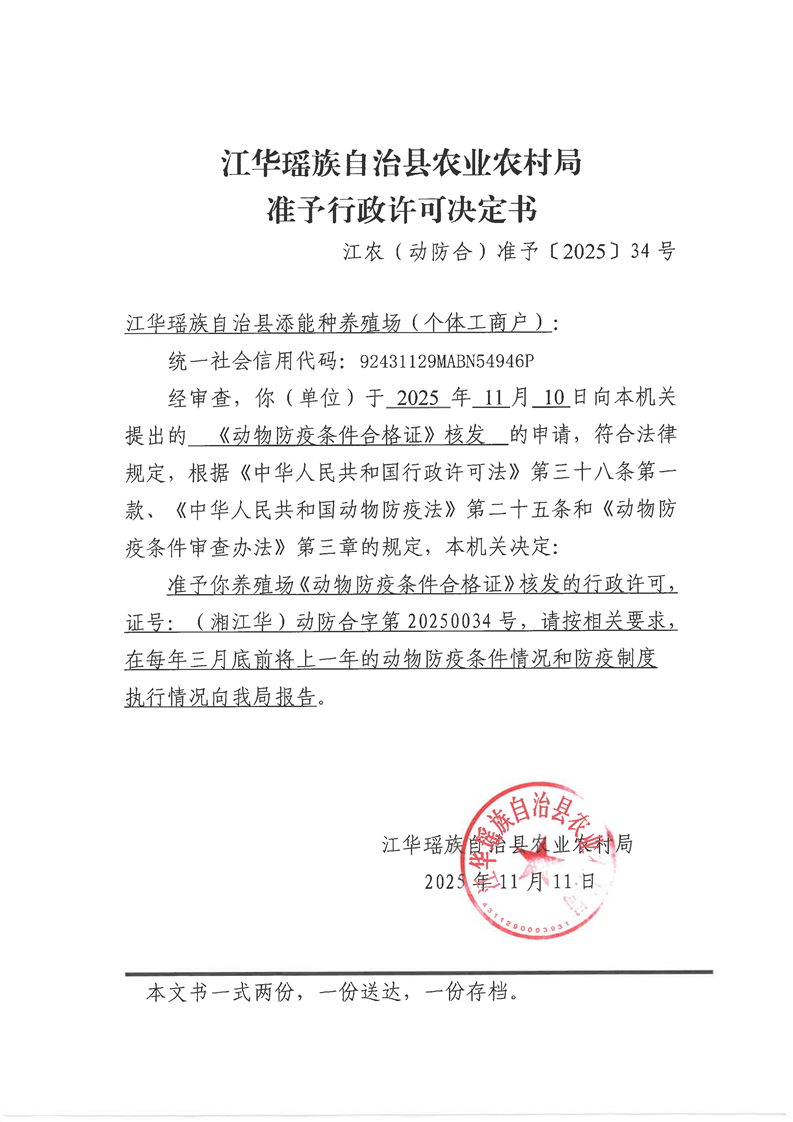 江华瑶族自治县农业农村局准与行政许可决定书