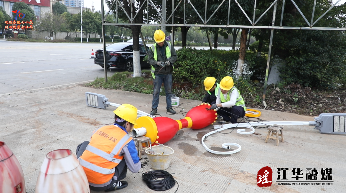 在瑶都大道施工现场,工作人员正进行腰鼓灯更换的高空作业。工人们有序操作,将原本褪色破损的旧灯罩进行拆卸,随后将新的灯罩进行加工组装,同时还对内部线路的老化和使用功能进行修复检查,确保每一盏路灯都能发挥最佳照明效果。