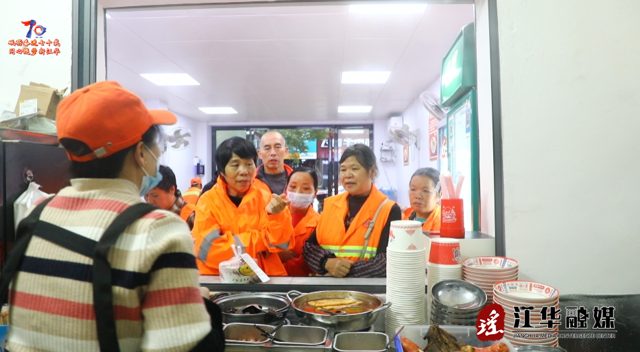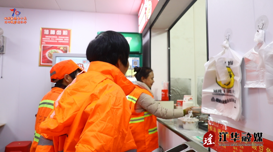 今年10月份,从外地返乡创业的邓向娟夫妇经营起“北冲卤粉店”,恰逢江华瑶族自治县成立70周年,夫妇二人也渴望为家乡建设做一份贡献,11月底,这份想为家乡建设的赤子之心转化为浓浓的善意,给环卫工人和外卖小哥提供了一份实在的温暖。