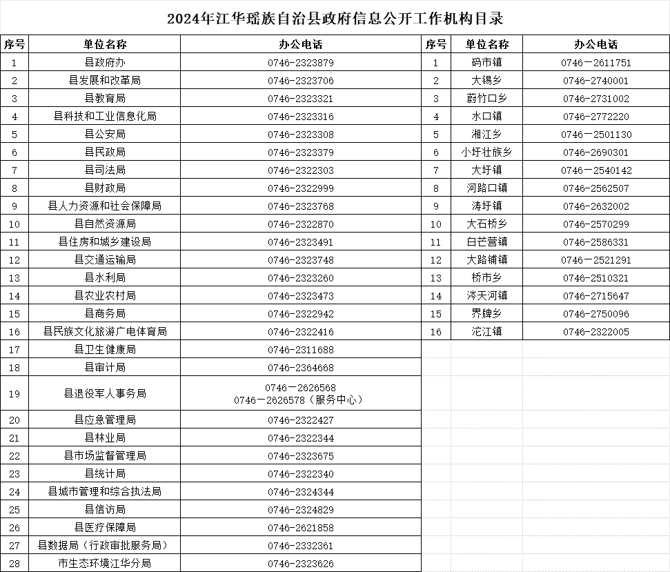 江华瑶族自治县各级各部门政府信息公开工作机构目录