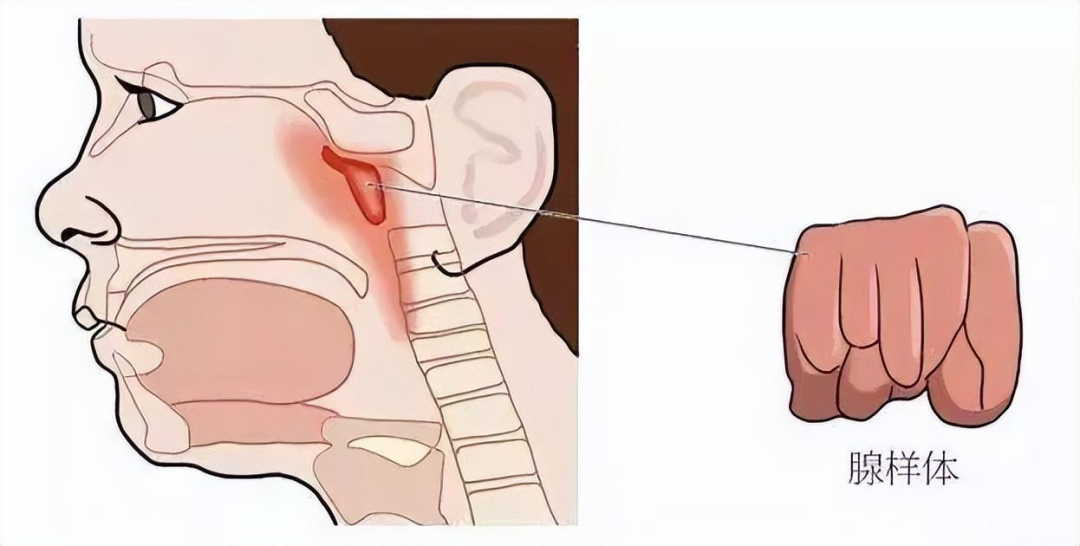 腺样体位于鼻腔最后端与咽喉的交界处,肥大的腺样体可使气道变窄,从而影响通气,出现张口呼吸、闭塞性鼻音、睡眠打鼾等症状,而通气障碍将会影响儿童夜间的血氧供应,出现身高发育迟缓、智力下降、注意力不集中等表现。