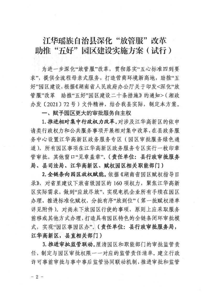 江华瑶族自治县人民政府办公室 关于印发《江华瑶族自治县深化“放管服”改革助推“五好”园区建设实施方案(试行)》的通知(以此为准)