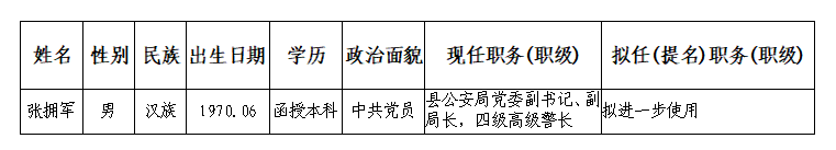 为了加强对干部选拔工作的监督,提高识别和任用干部的准确程度,现对县委常委会会议研究决定的下列1名拟任职(提名)人选进行任前公示: