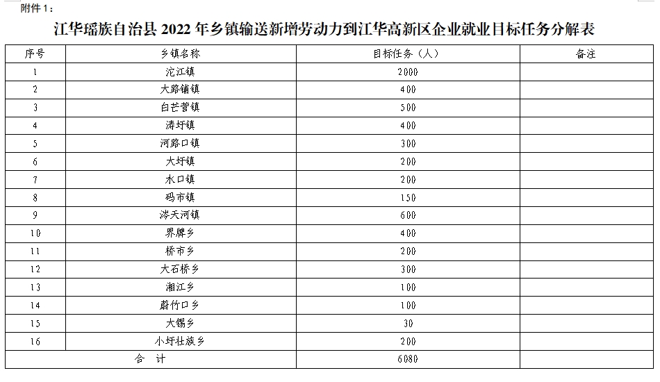 根据江华高新区用工需求实际,2022年各乡镇输送到高新区就业任务数共为6080人,各乡镇任务分配情况见附件1。
