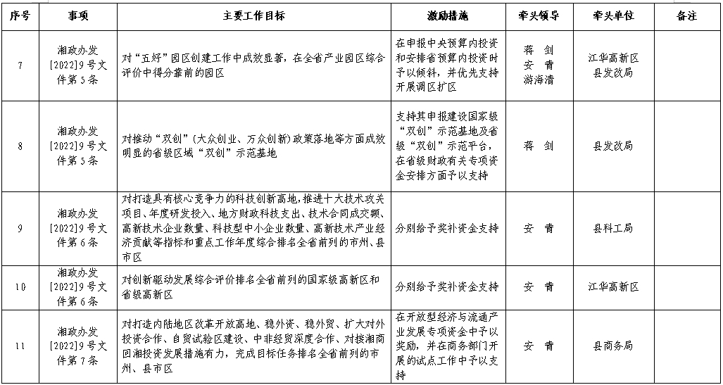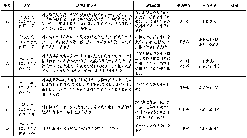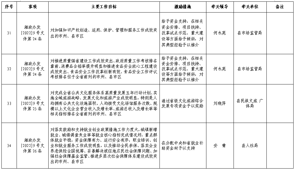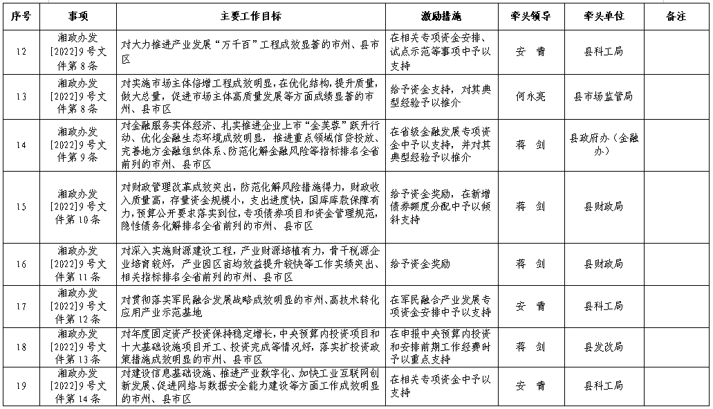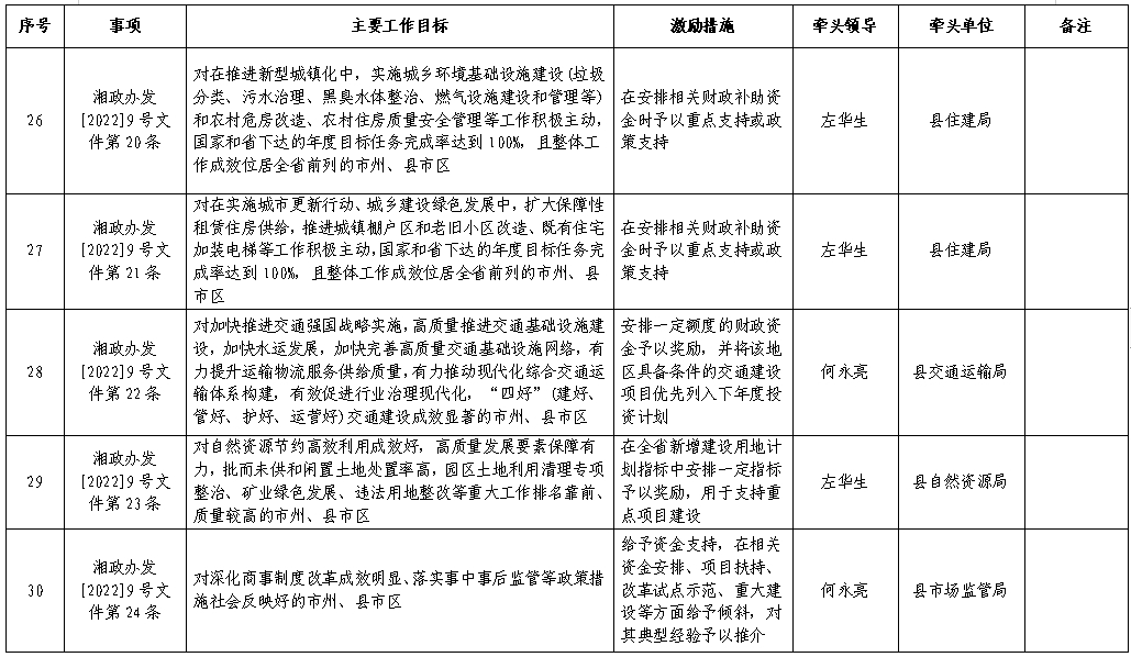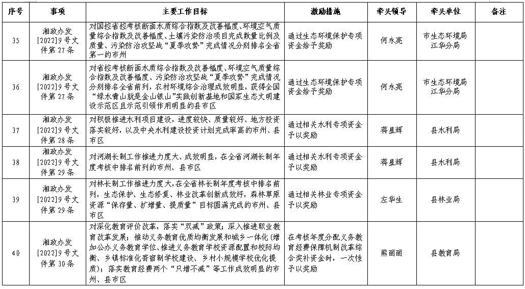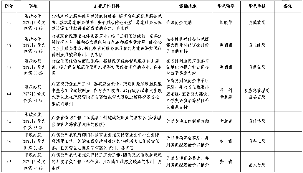 按照湘政办发〔2022〕9号文件明确的工作内容,2022年纳入省政府督查激励的工作共36条、47项具体事项(详见附表)。