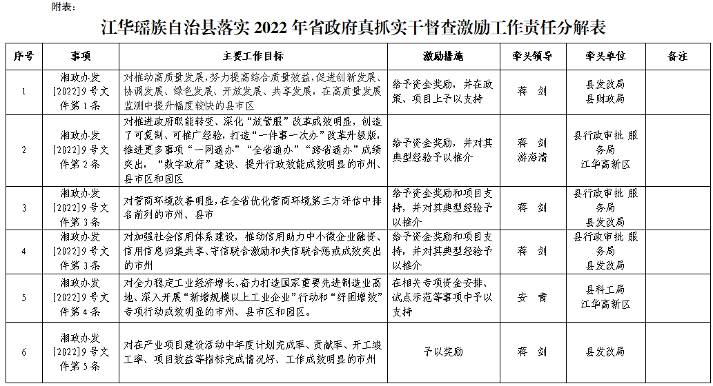 附表:江华瑶族自治县落实2022年省政府真抓实干督查激励工作责任分解表