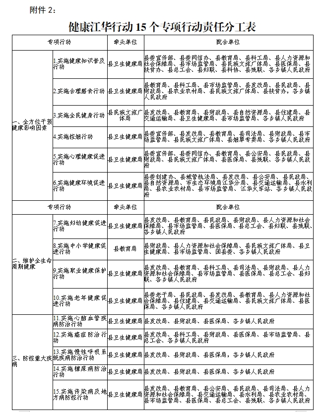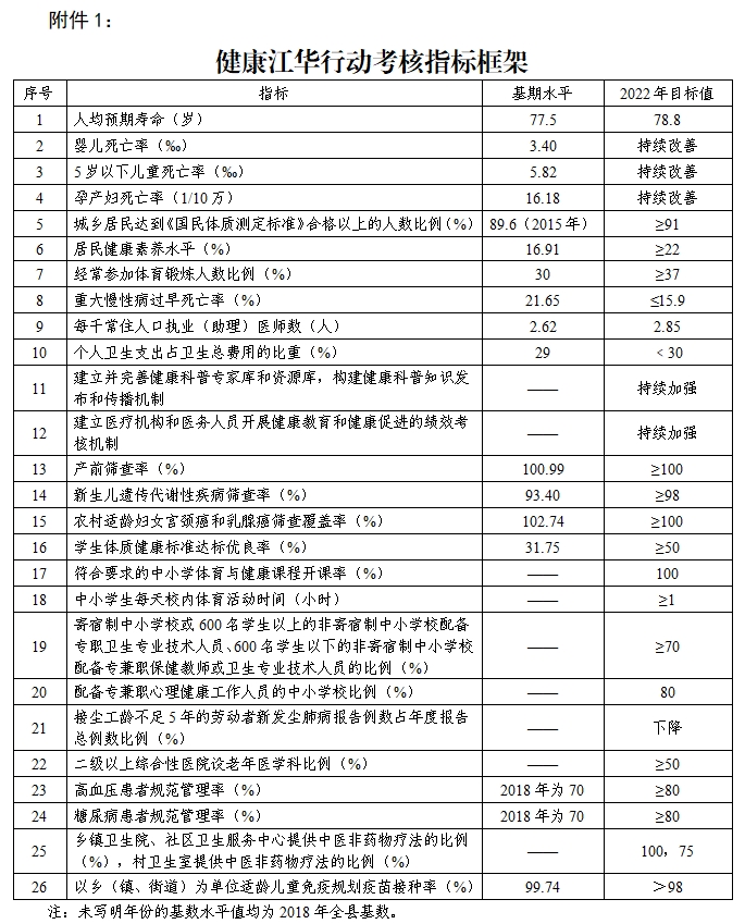 为贯彻落实健康中国战略,全面推动健康江华行动,提高全县人民健康水平,根据《国务院关于实施健康中国行动的意见》(国发〔2019年〕13号)、《湖南省人民政府关于健康湖南行动的实施意见》(湘政发〔2019〕23号)、《健康永州行动实施方案》(永政办发〔2020〕26号)等文件精神,结合我县实际,制定本实施方案。