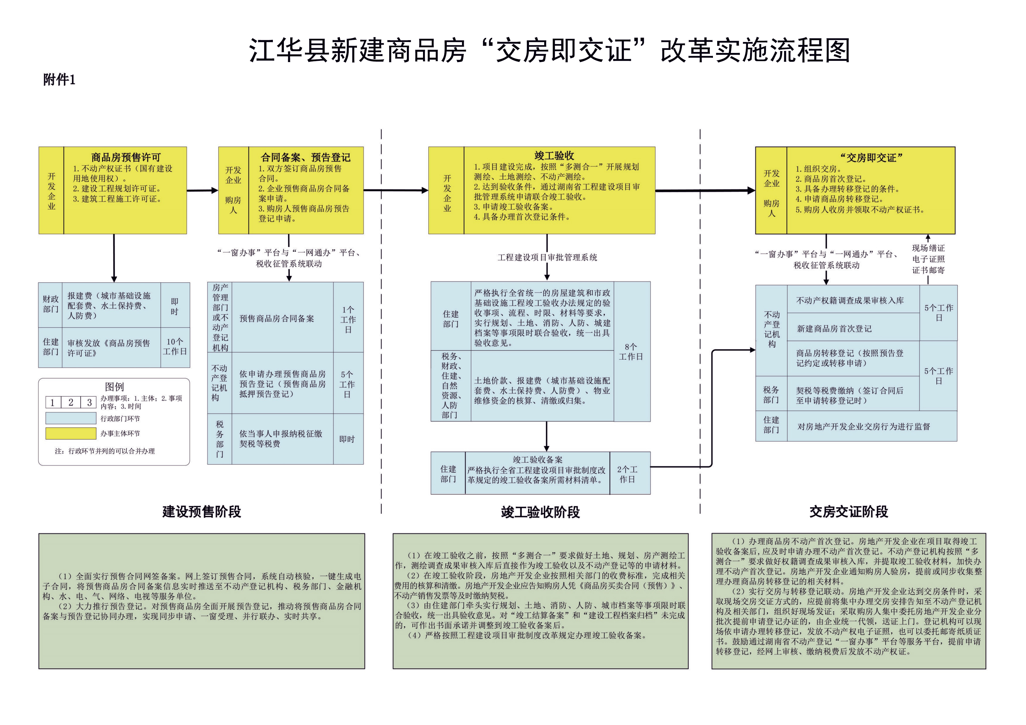 设立新建商品房“交房即交证”窗口,实行一窗受理和限时办结。将交房交证纳入江华县工程建设项目审批制度改革流程,在江华县工程建设项目审批管理系统中审批。各审批阶段实行全县统一的“一份办事指南、一张申请表单、一套申报材料”,所有资料内部流转,提高业务办理效率。开发建设单位只需要按照清单提供一套完整的进窗资料,有审批先后顺序的,先审批的部门要将审批结果发送至下一个部门,实现程序和审批情况可实时查询。(责任单位:县行政审批服务局、县自然资源局、县住建局、县人防办等单位)