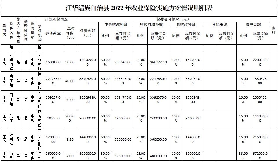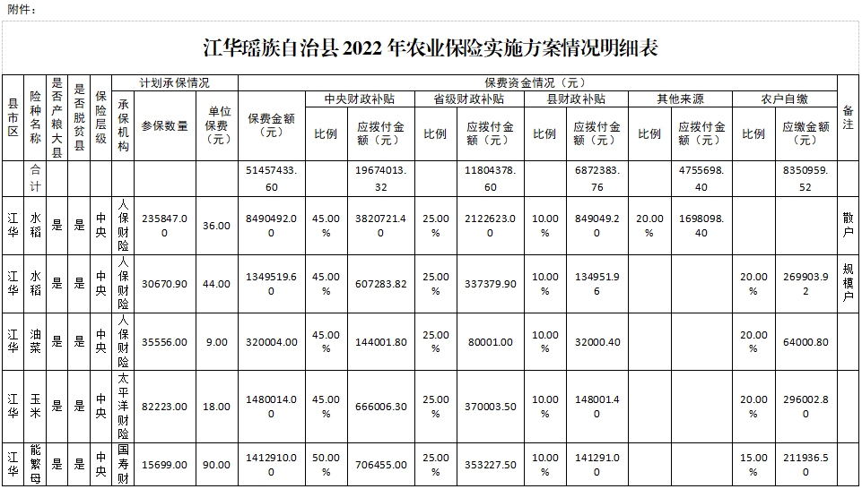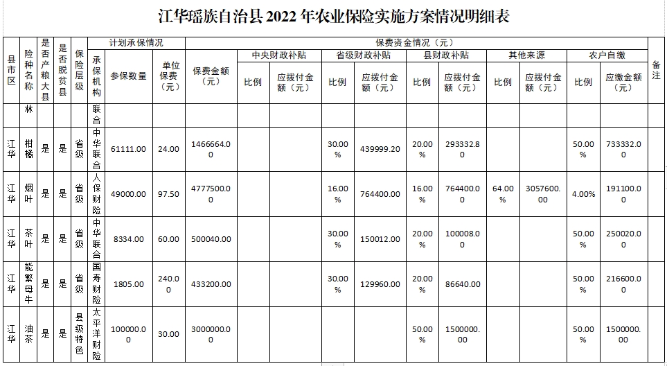附件:江华瑶族自治县2022年农业保险实施方案情况明细表