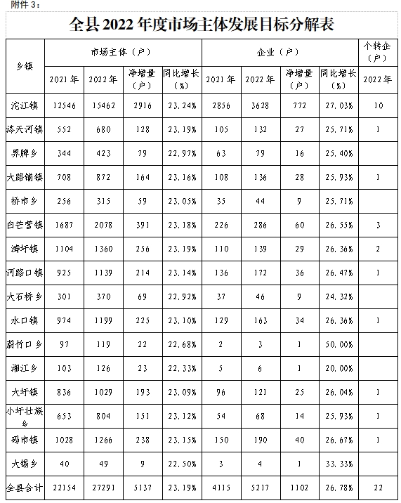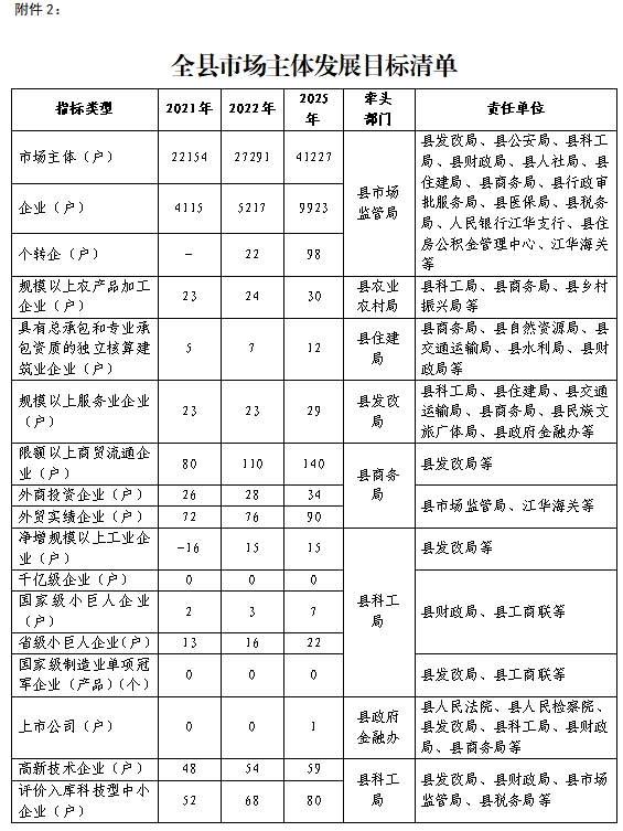 (一)市场主体多起来。到2022年底,全县市场主体发展到27291户,其中企业5217户;到2025年末,力争突破41227户,其中企业9923户。