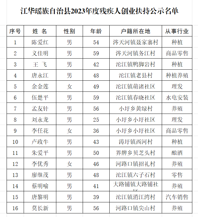 附件:江华瑶族自治县2023年度残疾人创业扶持公示名单