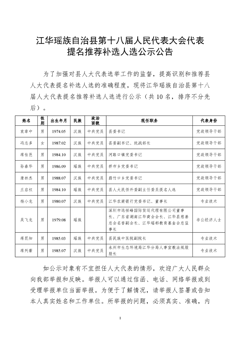 江华瑶族自治县第十八届人民代表大会代表提名推荐补选人选公示公告
