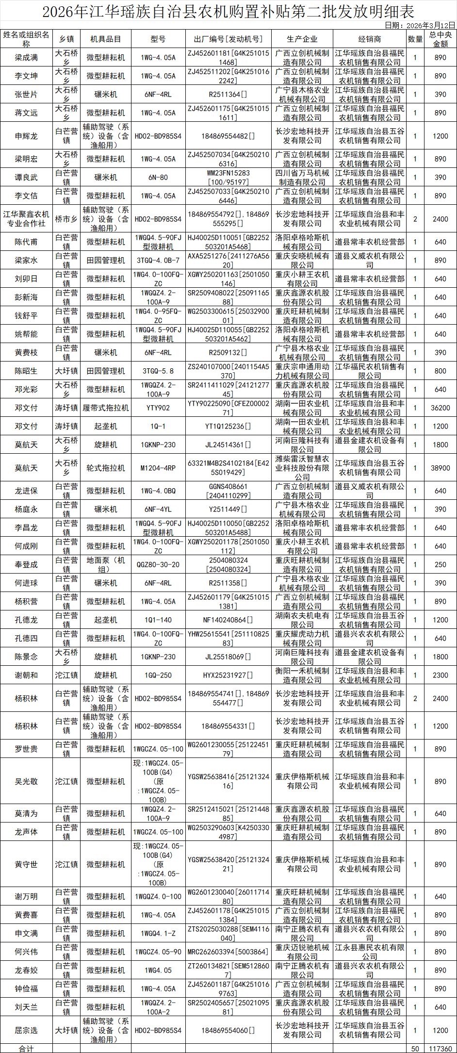 2026年江华瑶族自治县农机购置补贴第二批发放明细表