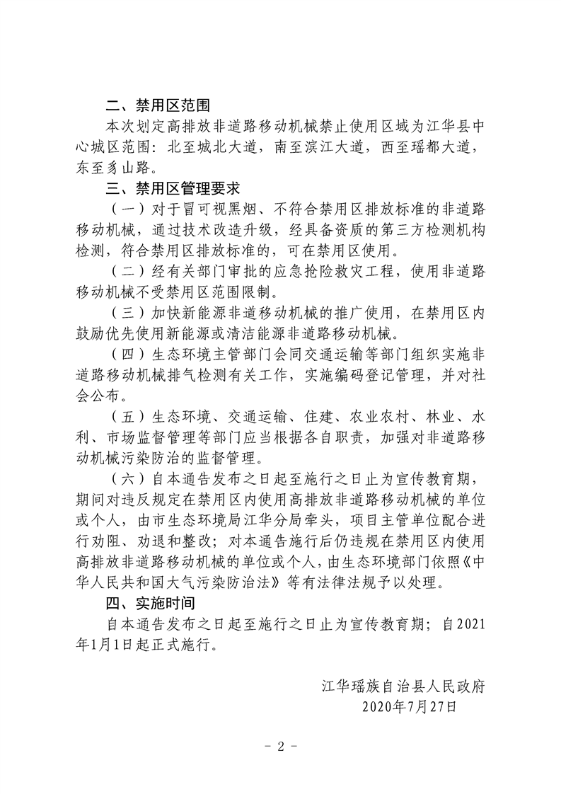 江华瑶族自治县人民政府关于划定禁止使用高排放非道路移动机械区域的通告