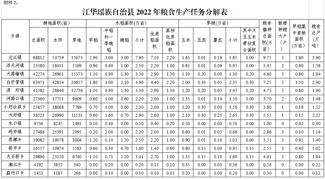 附件2:江华瑶族自治县2022年粮食生产任务分解表