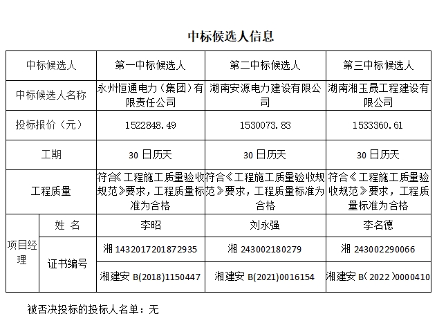 根据招标投标相关法律法规及招标文件的规定,江华县水口客运站35KV杆线改迁工程项目已于2023年12月1日9时30分在江华瑶族自治县重点项目服务中心开标、评标,本项目评标办法采用“经评审的最低投标价法”。评标委员会推荐了三名中标候选人(排序),现将相关信息予以公示。