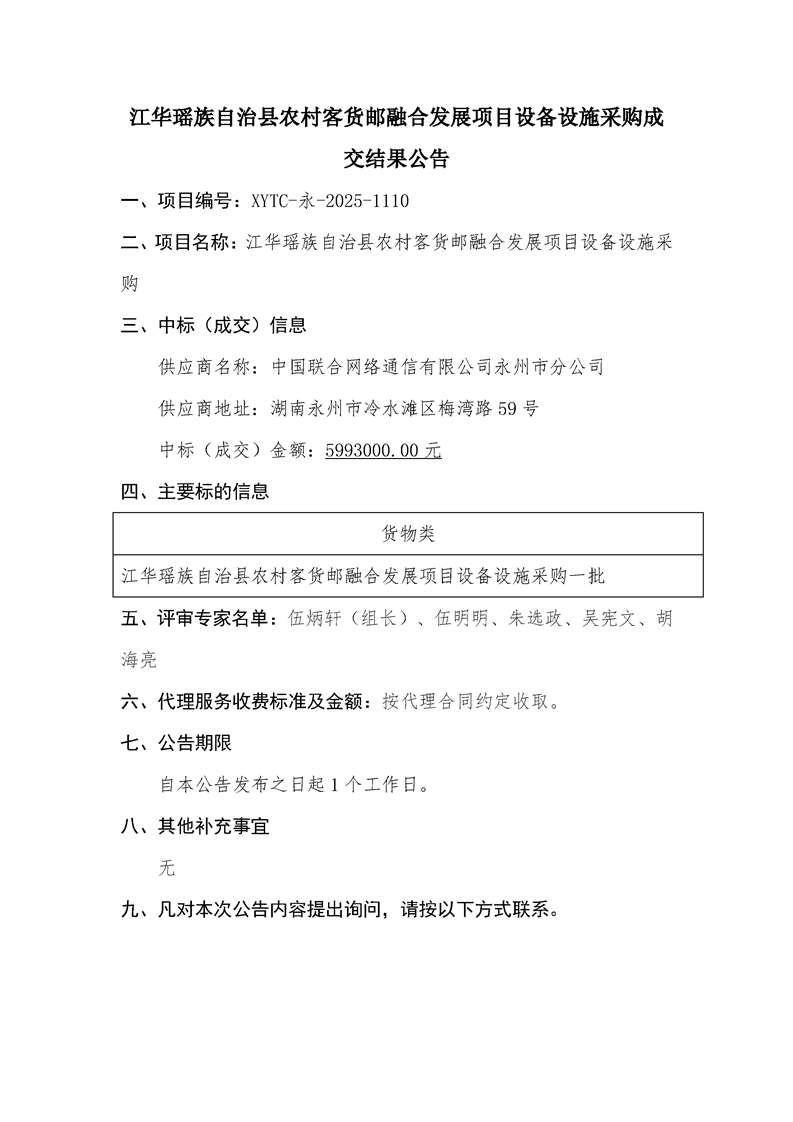 江华瑶族自治县农村客货邮融合发展项目设备设施采购成交结果公告