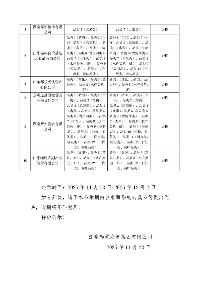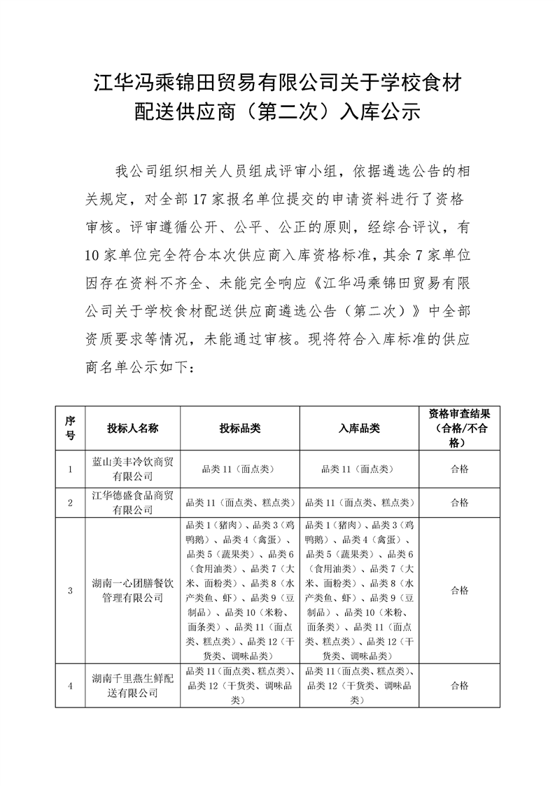 江华冯乘锦田贸易有限公司关于学校食材配送供应商(第二次)入库公示