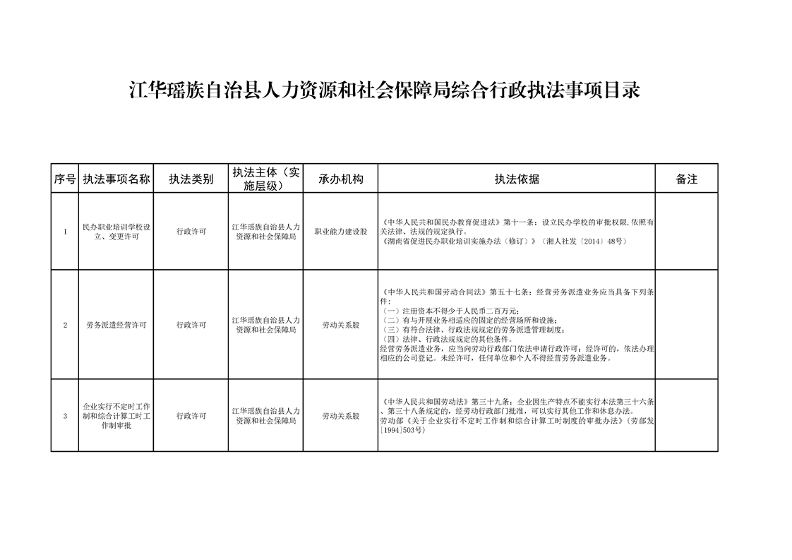 江华瑶族自治县人力资源和社会保障局行政执法事项目录