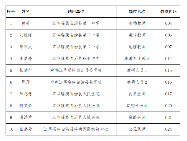 根据《江华瑶族自治县2025年引进急需紧缺专业人才公告》规定,经报名、资格审查、面试、体检、考察等程序,确定以下10名同志为江华瑶族自治县2025年引进急需紧缺专业人才拟聘用人员,现予以公示。