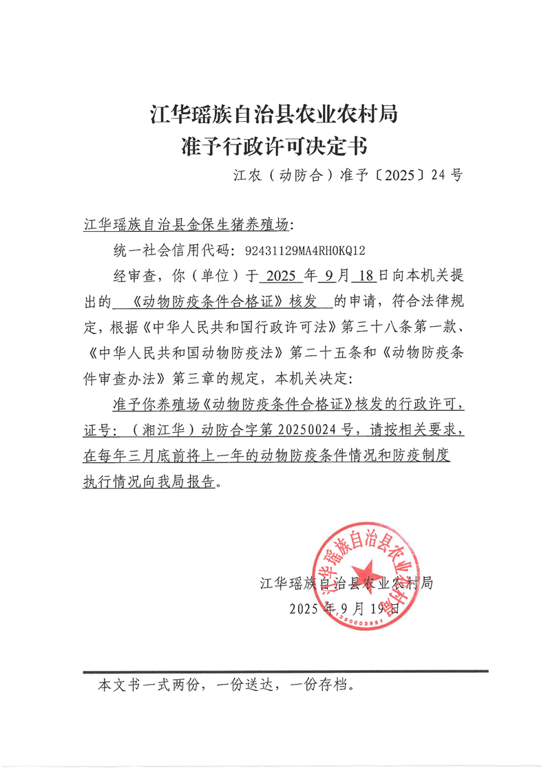 江华瑶族自治县农业农村局准予行政许可决定书