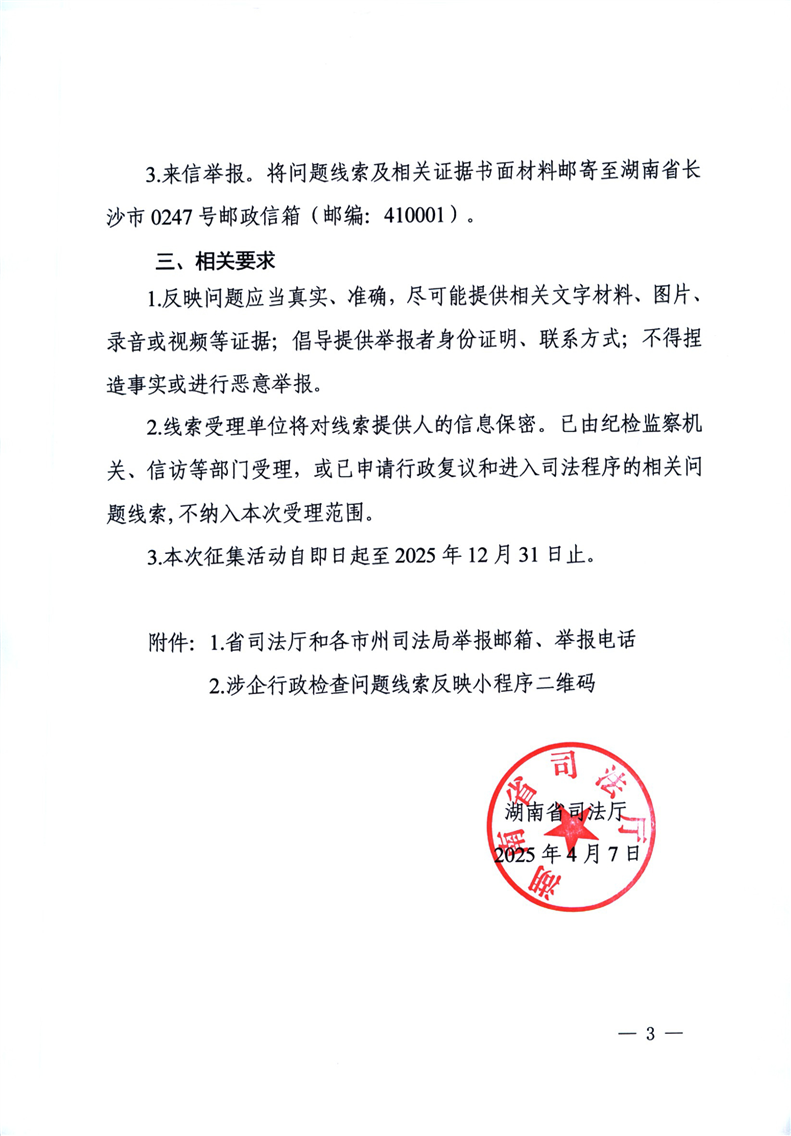 湖南省司法厅关于公开征集涉企行政执法领域突出问题线索的公告