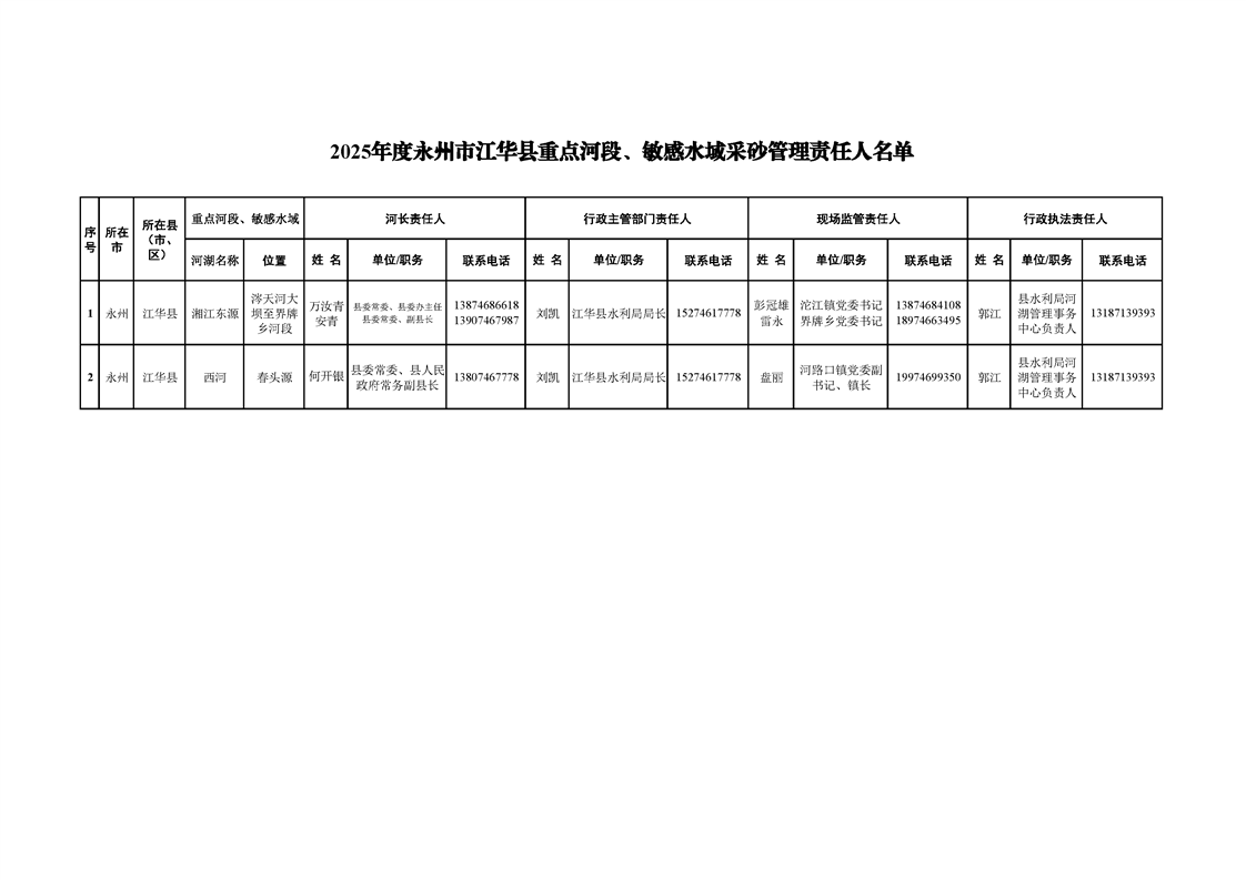 2025年度永州市江华县重点河段、敏感水域采砂管理责任人名单
