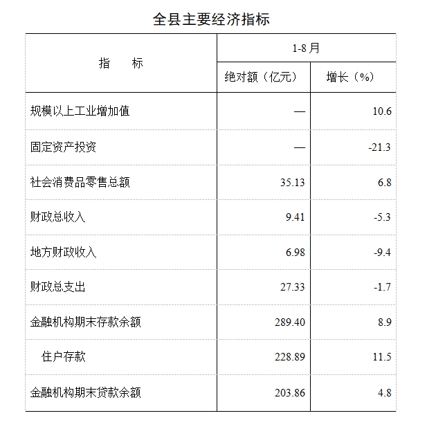 财政和金融。1-8月,全县完成财政总收入9.41亿元,同比下降5.3%。其中,地方财政收入6.98亿元,同比下降9.4%。非税收入占地方财政收入的比重为40.1%。全县财政支出27.33亿元,下降1.7%。其中,全县民生支出20.99亿元,占财政总支出的76.8%。8月末,全县金融机构存款余额289.40亿元,增长8.9%。其中,住户存款余额228.89 亿元,增长11.5%。金融机构贷款余额203.86亿元,增长4.8%。