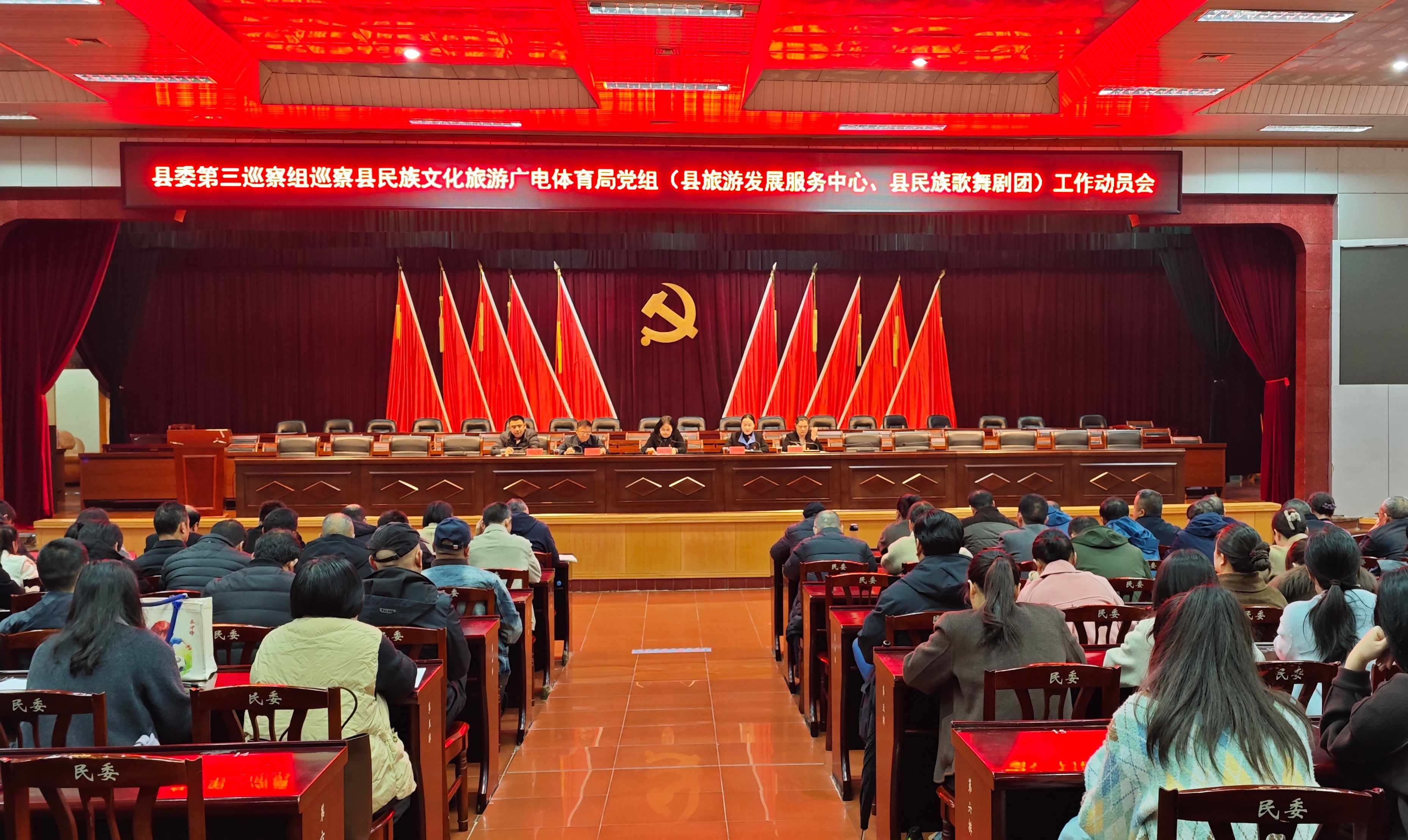 县委第三巡察组全体成员,县民族文旅广体局领导班子成员、局机关全体干部职工,县旅游发展服务中心、县民族歌舞剧团领导班子成员及干部职工,局属其他单位中层以上干部,近三年退休干部代表,县纪委监委派驻县委宣传部纪检监察组负责同志,以及部分“两代表一委员”等参加会议。