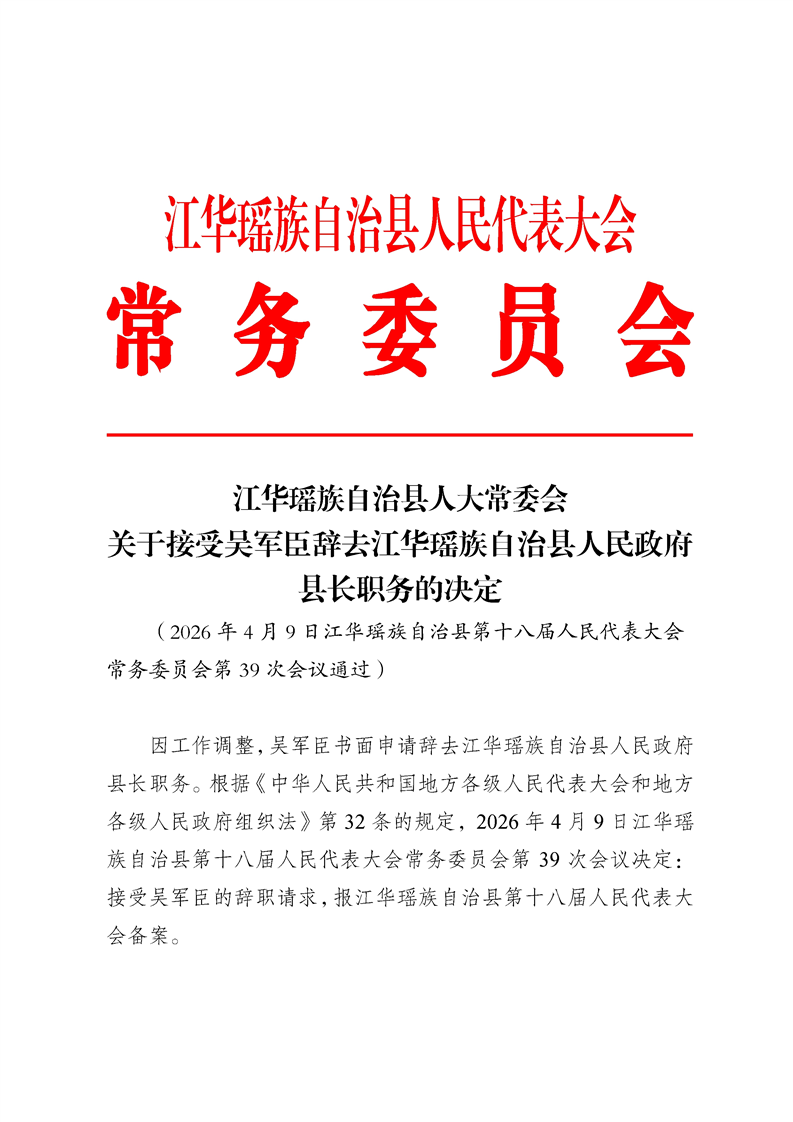 江华瑶族自治县人大常委会关于接受吴军臣辞去江华瑶族自治县人民政府县长职务的决定