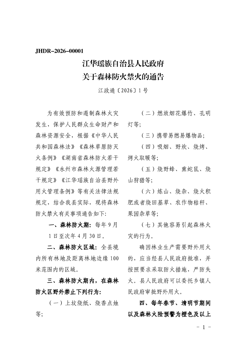 江华瑶族自治县人民政府关于森林防火禁火的通告