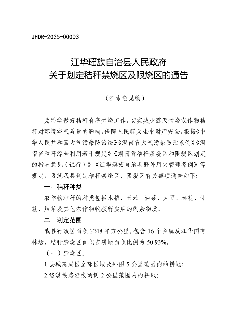 江华瑶族自治县人民政府关于划定秸秆禁烧区及限烧区的通告(征求意见稿)