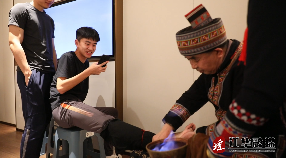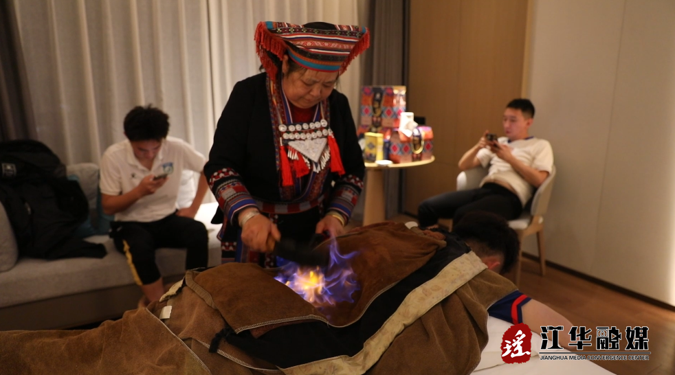 1月17日晚上,在参赛球员的房间里,瑶医正用传统“抓火疗法”为运动员放松腿部,燃烧的火焰在手掌控制下快速作用于皮肤,起到温通经络的效果。旁边,队员正在接受兽骨刮痧和瑶药足浴,空气中弥漫着淡淡的药材清香。这些源自深山瑶寨的古老技艺,正成为赛事期间运动员恢复体能的“健康助手”。