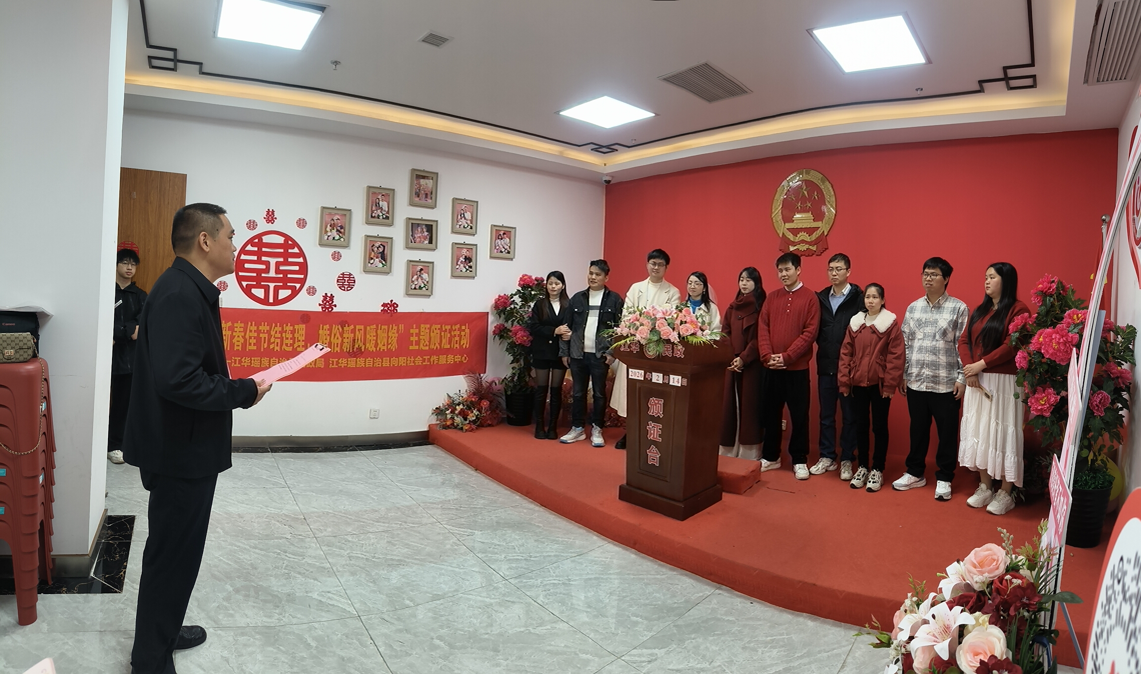 新春佳节至,良缘喜成双,江华瑶族自治县民政局婚姻登记处以“新春佳节结连理,婚俗新风暖姻缘”为主题,精心举办温馨庄重的集体颁证仪式,为登记领证的新人送上专属祝福,以仪式感赋能婚姻责任,以新风尚涵养婚俗文化,让喜庆年味与文明新风相融共生。