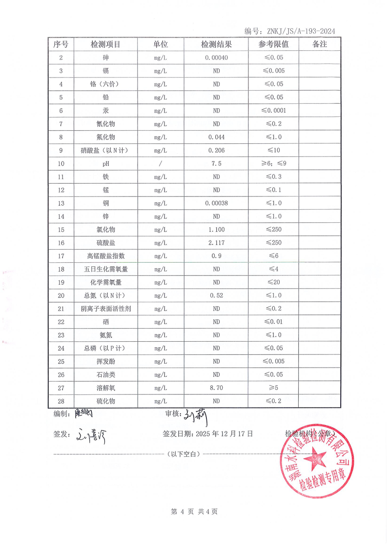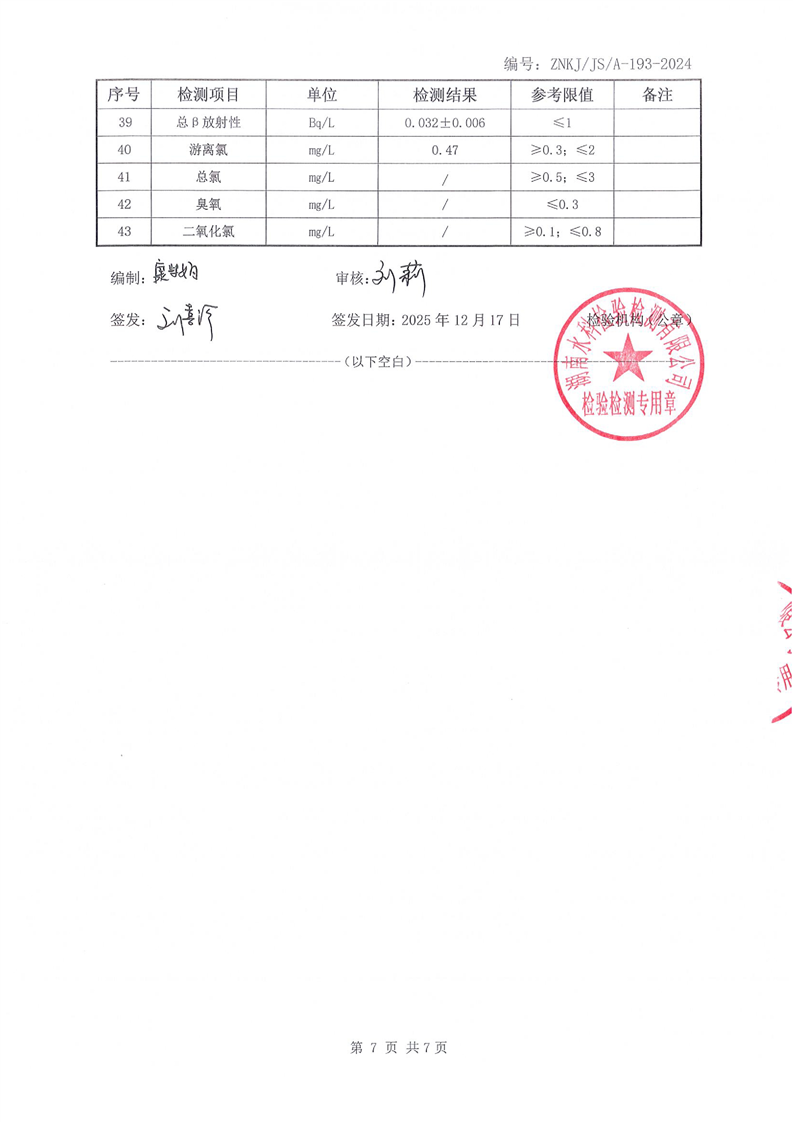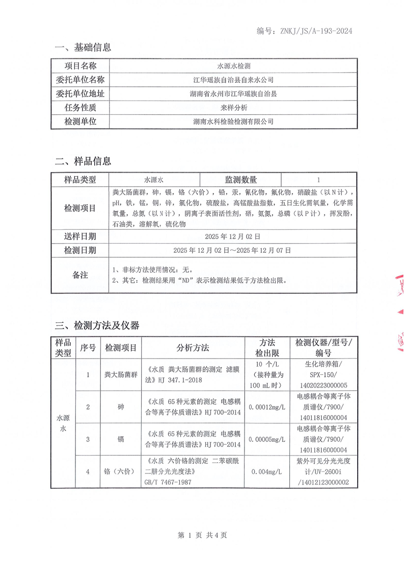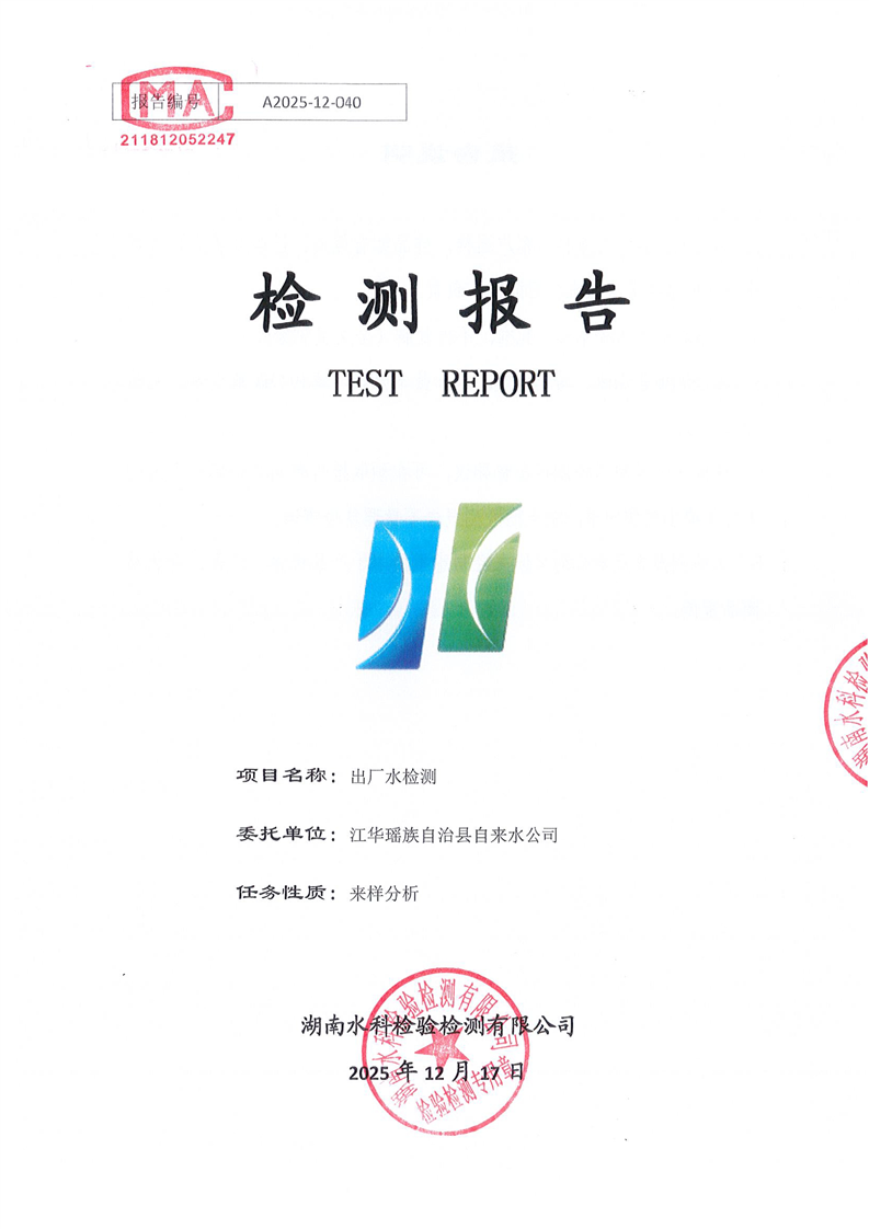 江华瑶族自治县自来水公司2025年12月份水质检测报告(43项)