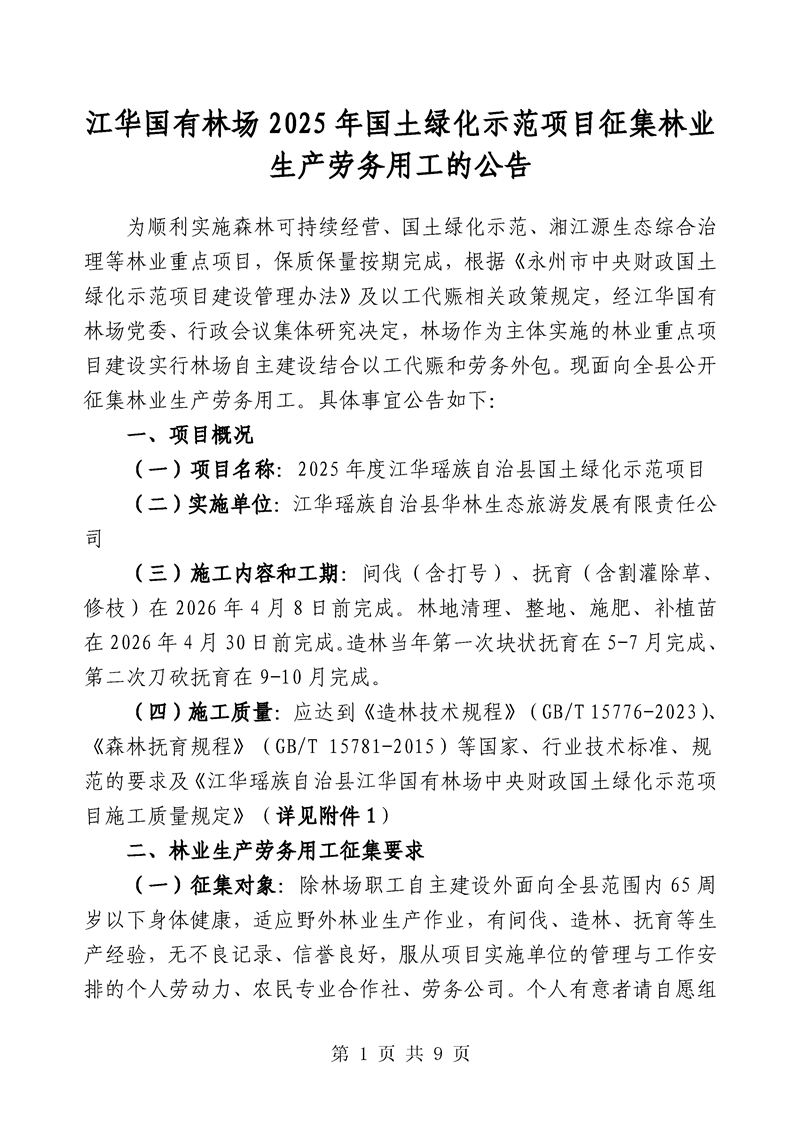 江华国有林场2025年国土绿化示范项目征集林业生产劳务用工的公告